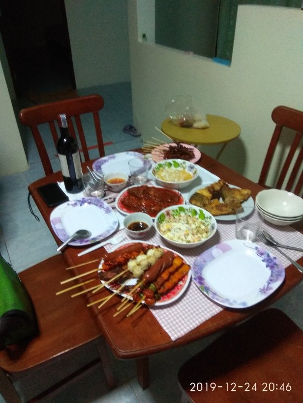 Ostatnie dni przedświąteczne spędzam przede wszystkim na robieniu porządków i zakupów, bo moja tajska „rodzina” zapowiada już wcześniej, że z pewnością nie zostawi mnie samej, zwłaszcza na Wigilię. W ten sposób zmusza mnie do przygotowania czegoś na stół wigilijny. Ponieważ moi tajscy przyjaciele wybierają się w czerwcu przyszłego roku do Polski, uznaję, że dobrze im jednak pokazać choć trochę, jak smakuje polska kuchnia, która nie wyciska łez z oczu i nie przepala całego przewodu pokarmowego. Przygotowanie czegoś polskiego i na dodatek tradycyjnego nie jest w Tajlandii rzeczą prostą, chociaż i tak jest już lepiej niż dwa lata temu. Mam oczywiście ze sobą cały zestaw polskich przypraw, których tutaj poprzednio nie znalazłam, ale jak tu zrobić przykładowo zwykłą sałatkę warzywną, kiedy nie można znaleźć np. korzenia pietruszki czy zwykłych, leśnych suszonych grzybów niezbędnych do ugotowania zupy grzybowej 🙂 Ale daję jakoś radę – jest i ala sałatka warzywna i sałatka z tuńczykiem jak również zupa grzybowa choć z tajskim, cieniutkim makaronem. Największym zaskoczeniem okazuje się być karp, na którego natykam się w tutejszym, dużym markecie. I to już jest kompletna niespodzianka. Jest trochę szczuplejszy od naszego, trochę jaśniejszy, ale jest. I tym samym serwuję moim młodym przyjaciołom prawie tradycyjne, polskie dania 🙂 Na wszelki wypadek kupuję także bardzo ostry sos, gdyby jednak musieli te nasze dania czymś doprawić 🙂 Oni przywożą swoje tajskie przysmaki i tym sposobem kolacja wigilijna robi się międzynarodowa :). Żeby było choć trochę świątecznie, zawieszam w pokoju choinkowe lampki i robi się miło.