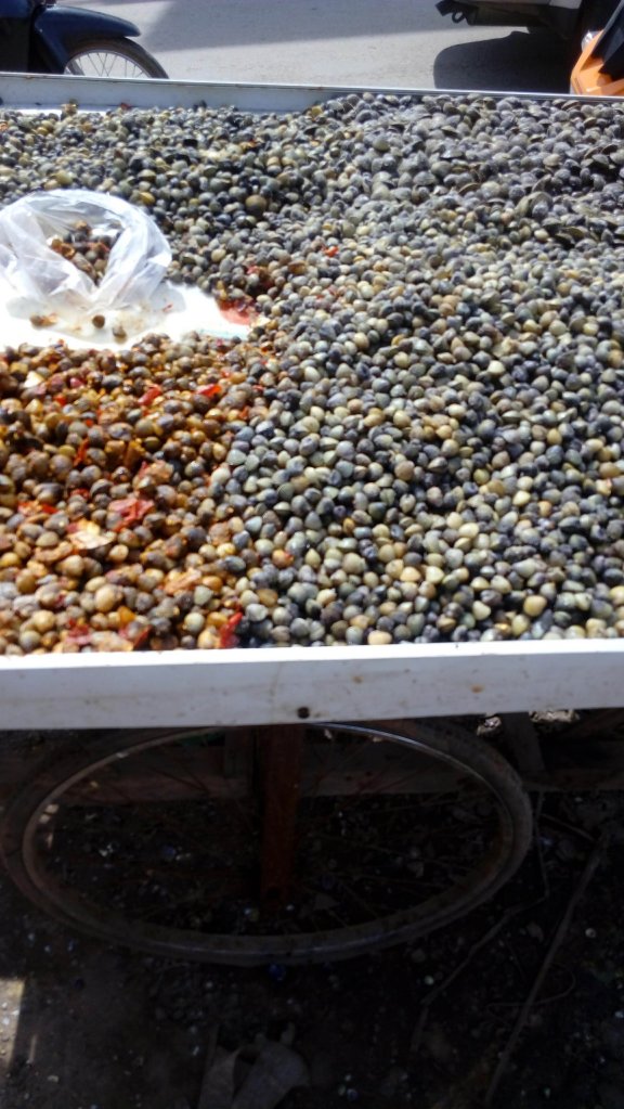 Po krótkim wypoczynku w hotelu biorę głęboki oddech i wychodzę na ulicę. Głęboki, bo już jadąc do hotelu, coś niecoś wpadło mi w oczy. Dopiero teraz mam wrażenie, że dotarłam do tej prawdziwszej części Azji. Ulica, przy której jest mój hotel nie należy do najgłówniejszych, ale jest wystarczająco duża i ruchliwa, żeby złapać pierwsze wrażenia 🙂 O asfalcie na jezdni raczej można zapomnieć, a o chodnikach nie ma nawet co wspominać 🙂 Przeciskam się praktycznie pomiędzy straganami, samochodami, skuterkami. Kurz, nieprawdopodobny bałagan wszędzie, brud. Stragany z owocami, warzywami, mikroskopijnymi małżami otoczonymi w czymś tam poprzeplatane stoiskami z telefonami różnych marek i sklepikami z chińszczyzną. Hałas, wszyscy na wszystkich trąbią, na moich oczach, potrącona na skuterze dziewczyna, przewraca się na środku tej drogi.