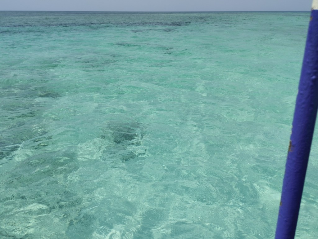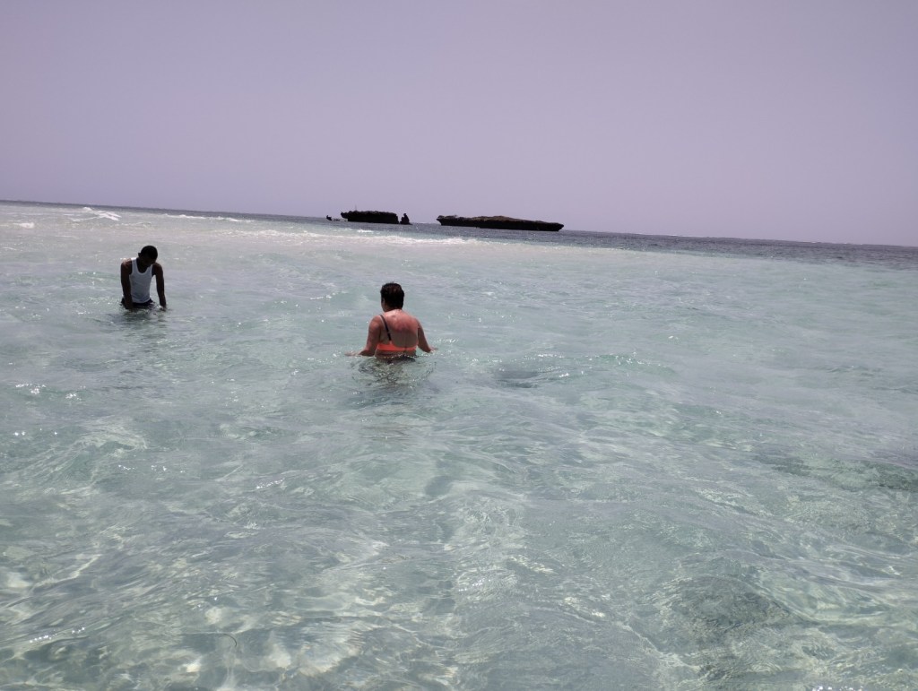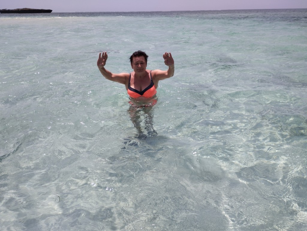 Po powrocie płyniemy jeszcze na skraj raf, gdzie na środku oceanu odpływ właśnie odkrywa powoli małą, piaszczystą wyspę, z fantastycznie w tym momencie zieloną i cieplutką wodą, co pozwala znowu wyskoczyć do wody i tym razem się po prostu popluskać. Raj, prawdziwy raj.