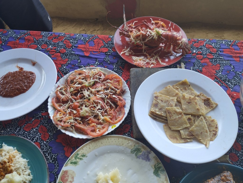Z pięknego raju ruszamy do wioski. Czeka tam na nas lunch w lokalnej restauracji z widokiem na ocean. Na stół wjeżdżają potrawy: ryż, jakaś jarzynka z alg albo innej morskiej roślinności, wspaniale przygotowana ryba, gotowane korzenie czegoś tam, nota bene, pyszne, grillowane krewetki i mały homar. Jedzenie rozpływa się w ustach 🙂