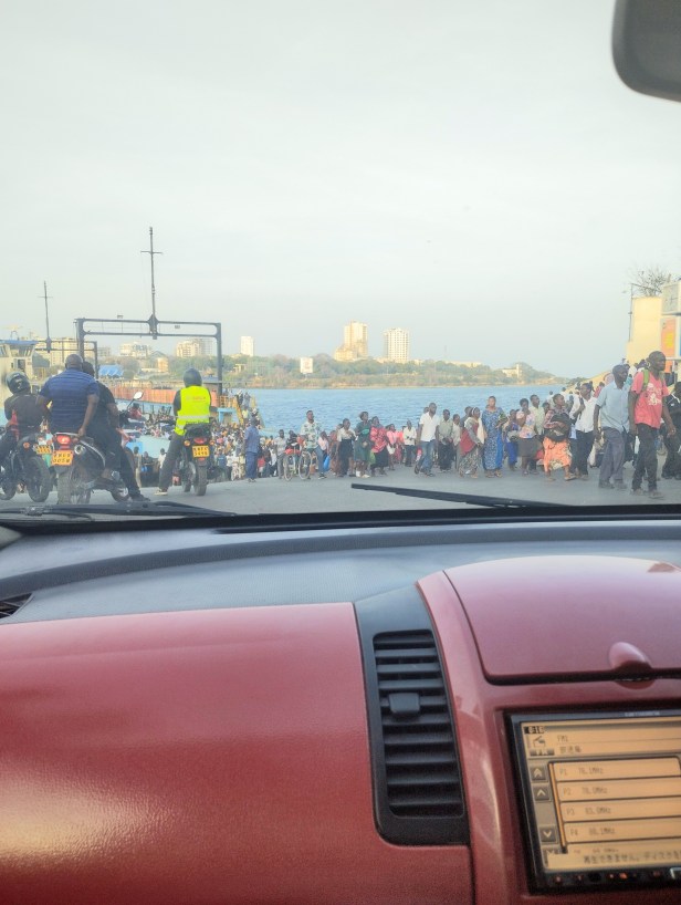 Z uwagi na swoje położenie, aby z niej wyjechać, w zależności od obranego kierunku jedzie się mostem (w kierunku Somali) lub przeprawia się promem w kierunku Tanzanii. Dzisiaj właśnie czeka na nas ta druga opcja. Rankiem, bez specjalnych problemów i czekania wjeżdżamy na prom i dosyć szybko przedostajemy się na drugą stronę, gdzie, jak się okazuje, czeka na niego setki mieszkańców, żyjących w tej podmiejskiej części miasta, ale dojeżdżających do pracy w jego centrum. Promów kursuje kilka i wszystkie zabierają zarówno pieszych jak i zmotoryzowanych w obydwu kierunkach. My mamy szczęście, bo jedziemy w przeciwnym niż większość o tej porze.