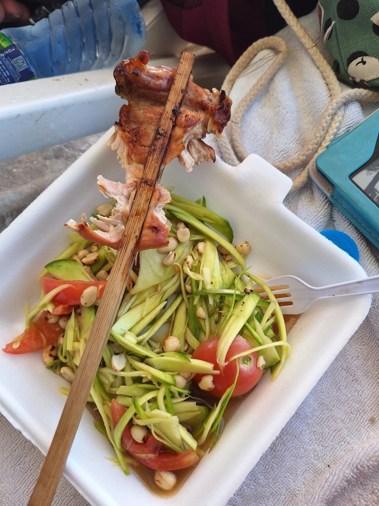 Jeśli chodzi o jedzenie, to w zależności od potrzeb i miejsca, w którym się jada, można spokojnie przeżyć w granicach od 100 do 350 THB dziennie. Obecny przelicznik to: 100 THB = 11.24 zł. Mówię tu o normalnym życiu a nie „bywaniu” w drogich restauracjach. A oto przykłady tajskich dań, których ceny kształtują się od 30 THB za wspaniałą sałatkę z zielonego mango do najdroższego dania za 200 THB. Wszystko pyszne, świeże i pikantne w zależności od upodobań. Ja powoli przechodzę na te wypalające po trosze przełyk 🙂 To też jest proces adaptacyjny.