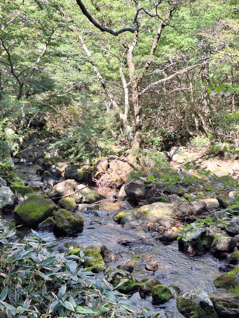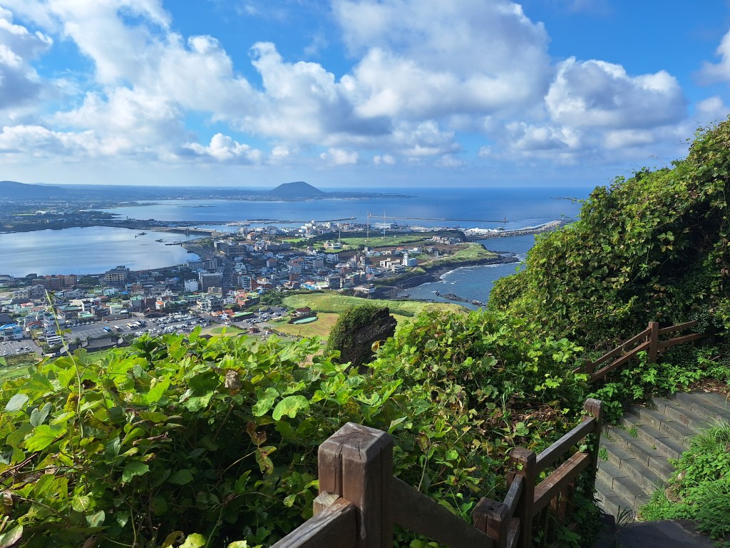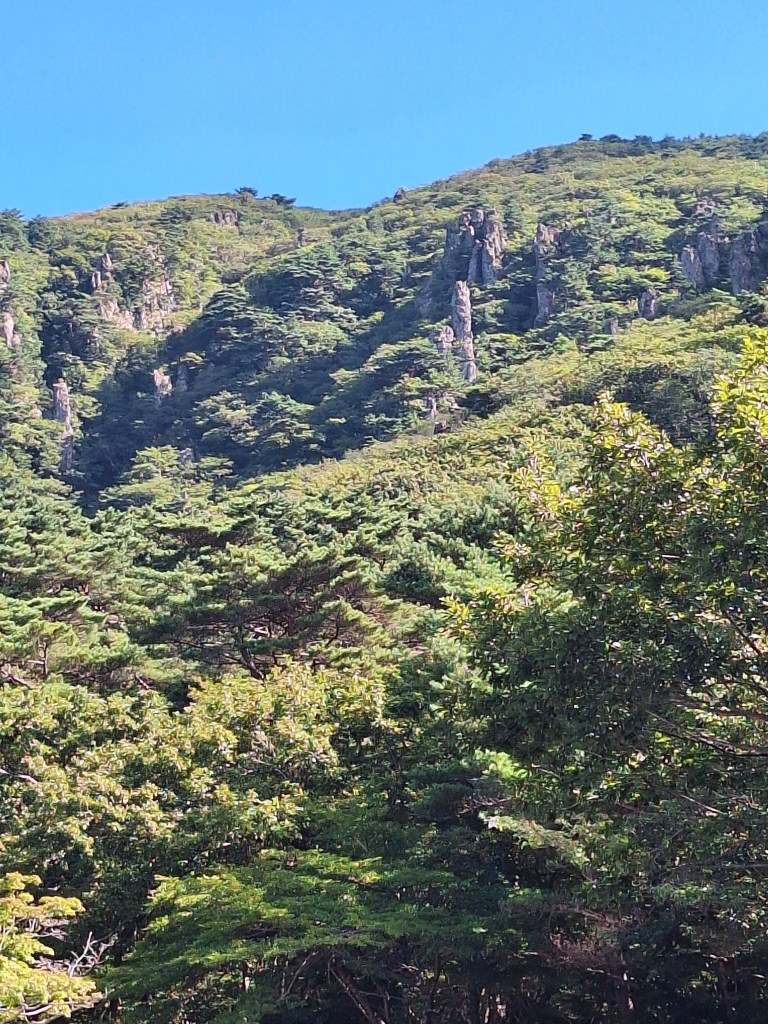 Zastanawiałam się, przez te minione dni jak wyruszyć dalej, żeby zobaczyć coś więcej na tej wyspie niż tereny w zasięgu pieszych spacerów. W końcu zdecydowałam się wejść do pobliskiej knajpy i zapytać, czy nie mogliby kogoś polecić, kto by mnie zabrał samochodem i obwiózł po w miarę atrakcyjnych miejscach. I to była najlepsza opcja. Wczoraj rano zajechał po mnie starszy, uroczy pan, nie mówiący ani w ząb po angielsku, z którym porozumiewaliśmy się trochę przez tłumacza na telefonie i trochę na migi, a który przez cały boży dzień obwoził mnie po centralnych, północnych, wschodnich i w jakiejś części południowych terenach wyspy. I to już była bajka, Na początek Hallasan Park, czyli tereny otaczające słynny, uśpiony wulkan. Pamiętając przygodę na Sumatrze, przezornie na sam wulkan się nie wybrałam, natomiast zrobiłam dosyć długi spacer w kierunku ciekawych szczytów. Schody, kładki, mostki, strumienie, zielono.