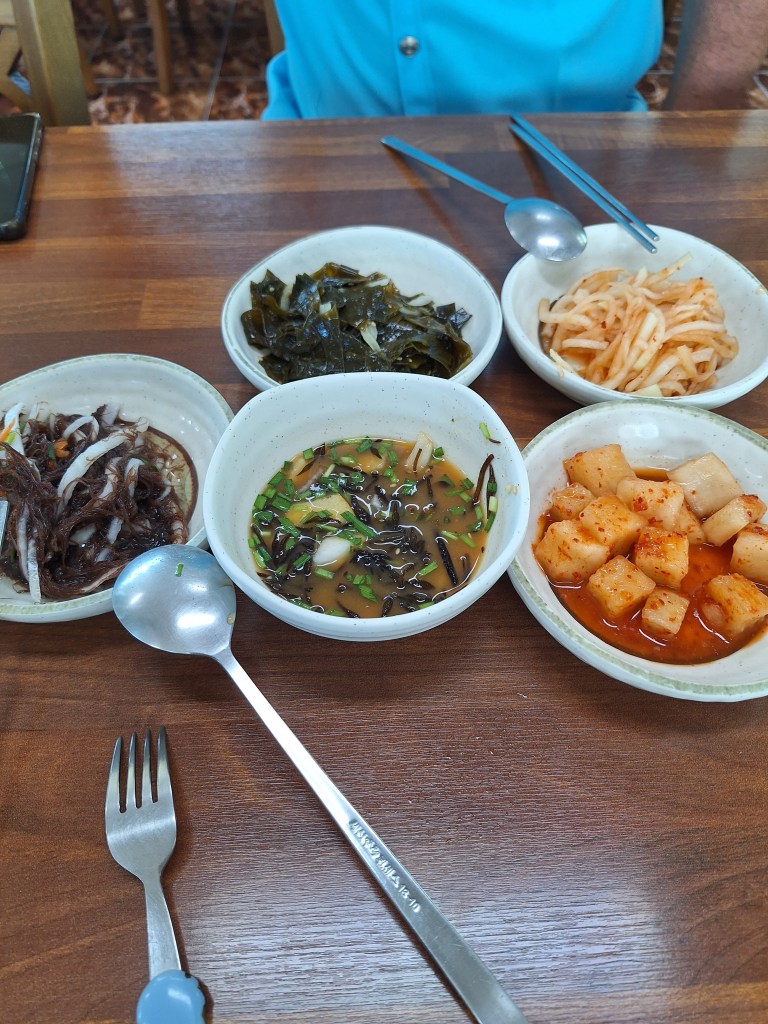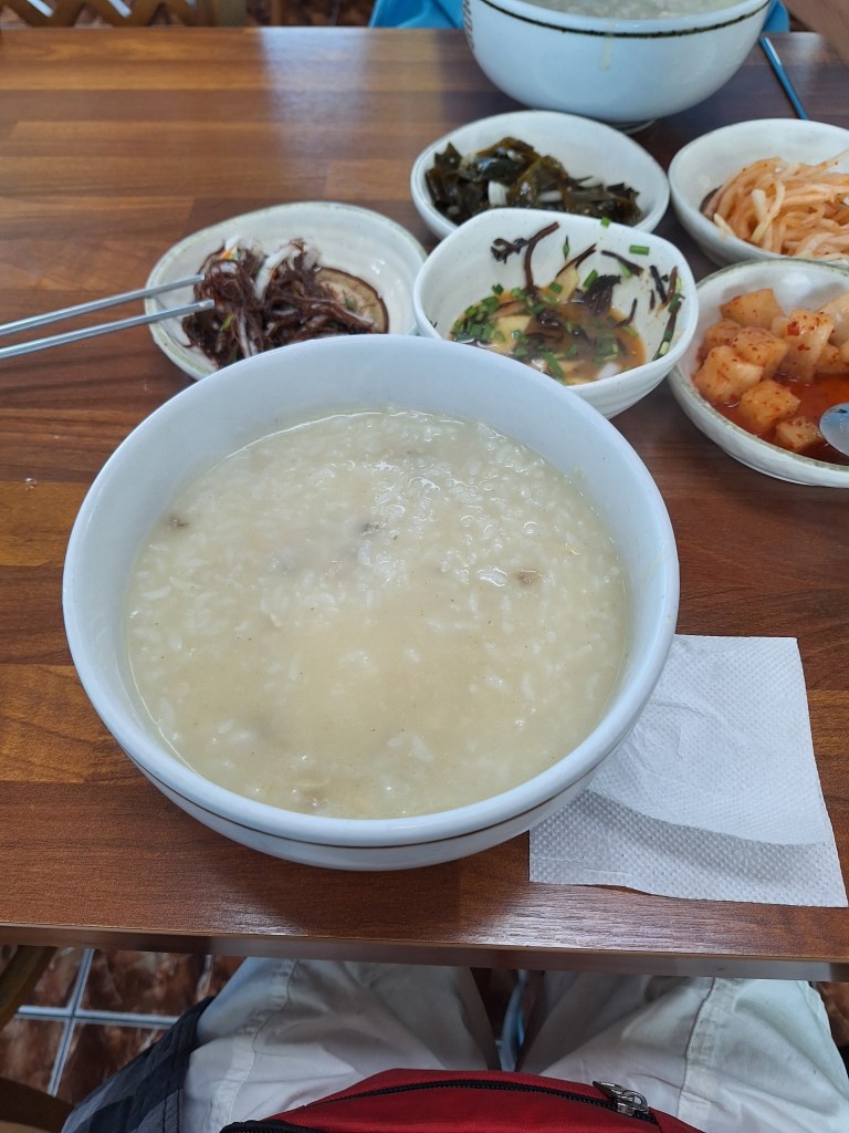 Na obiad jadłam coś, co trochę przypomina nasze szpitalne kleiki, a co jest narodową potrawą Koreańczyków. Podają to na śniadania, w chorobie (niczym u nas rosół 🙂 ) i jak widać na lunch można też to dostać. Ja w każdym bądź razie tego nie zamawiałam, aczkolwiek zjadłam ze smakiem, bo nie było to najgorsze.