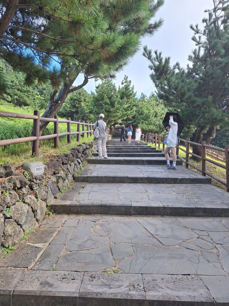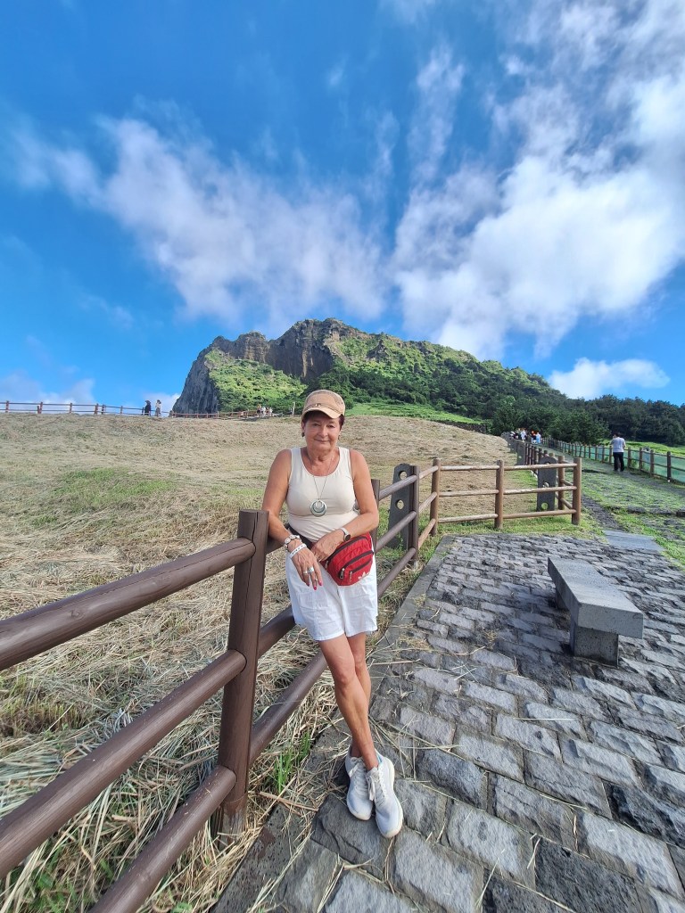 Po lunchu wyprawa Seongsan Ilchulbong Marine Provincial Park. No i tu się zaczęło. Miałam już w nogach około 8 km, więc kiedy spojrzałam na górę i na plakat z zaznaczoną trasą, stwierdziłam – nie idę. Zrobię parę zdjęć z dołu i wystarczy. Upał 34 stopnie, słońce świeci jak szalone – nie będę się zabijać 🙂