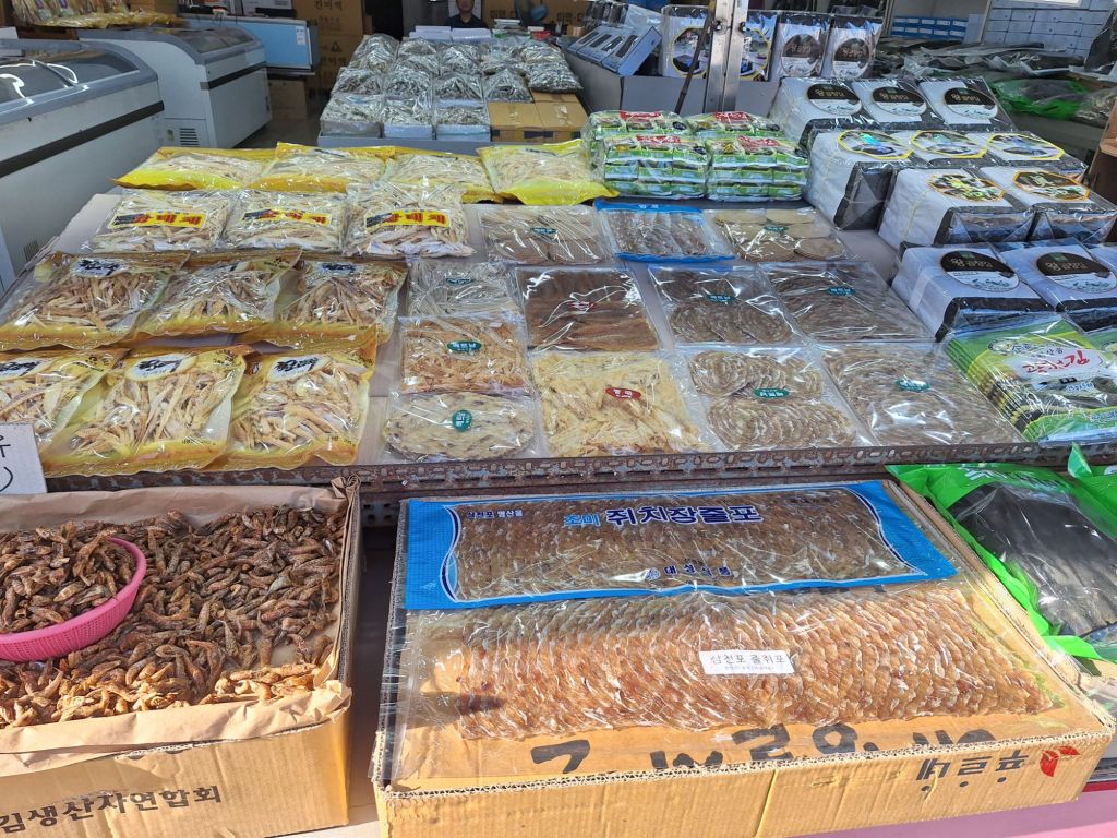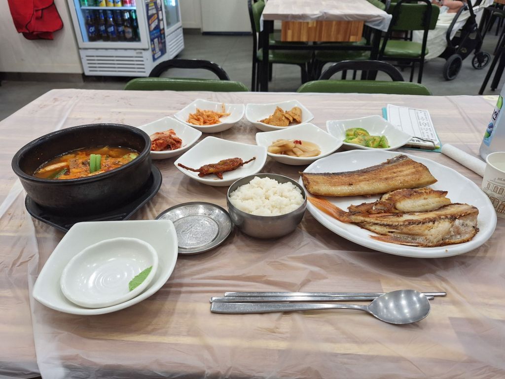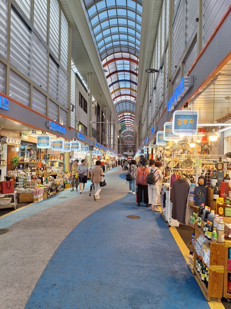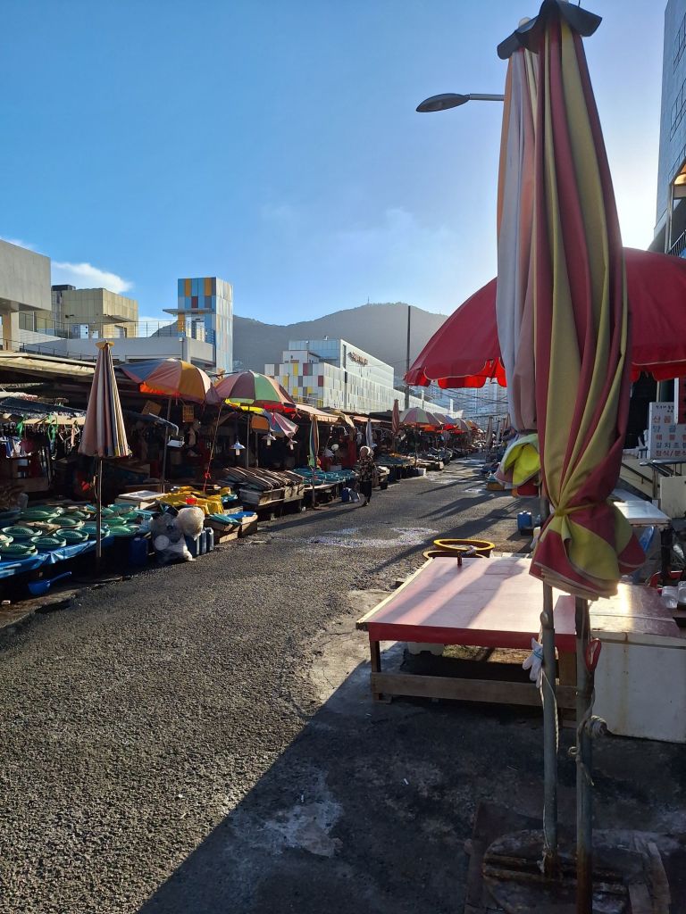 Jedną z dalszych atrakcji miał być Jinyang Fishing Market czyli rynek rybny, Busan Jagalchi Market i ich można powiedzieć handlowa okolica. Rynek rybny częściowo wypełniony stoiskami ze sprzętem rybackim, a częściowo oczywiście pełen akwariów z pływającymi w nich różnymi formami fauny morskiej. Co jakiś czas pojawiał się mały barek, do którego próbowano wciągać przechodniów i w których można było popróbować czegoś z tych pływających w akwariach stworzeń. Udało się jednym wciągnąć i mnie 🙂 choć nie jestem szczególną fanką ryb, to tym razem posiłek składający się ze smażonej, dobrej ryby i przepysznej zupy rybnej dało się spokojnie skonsumować.