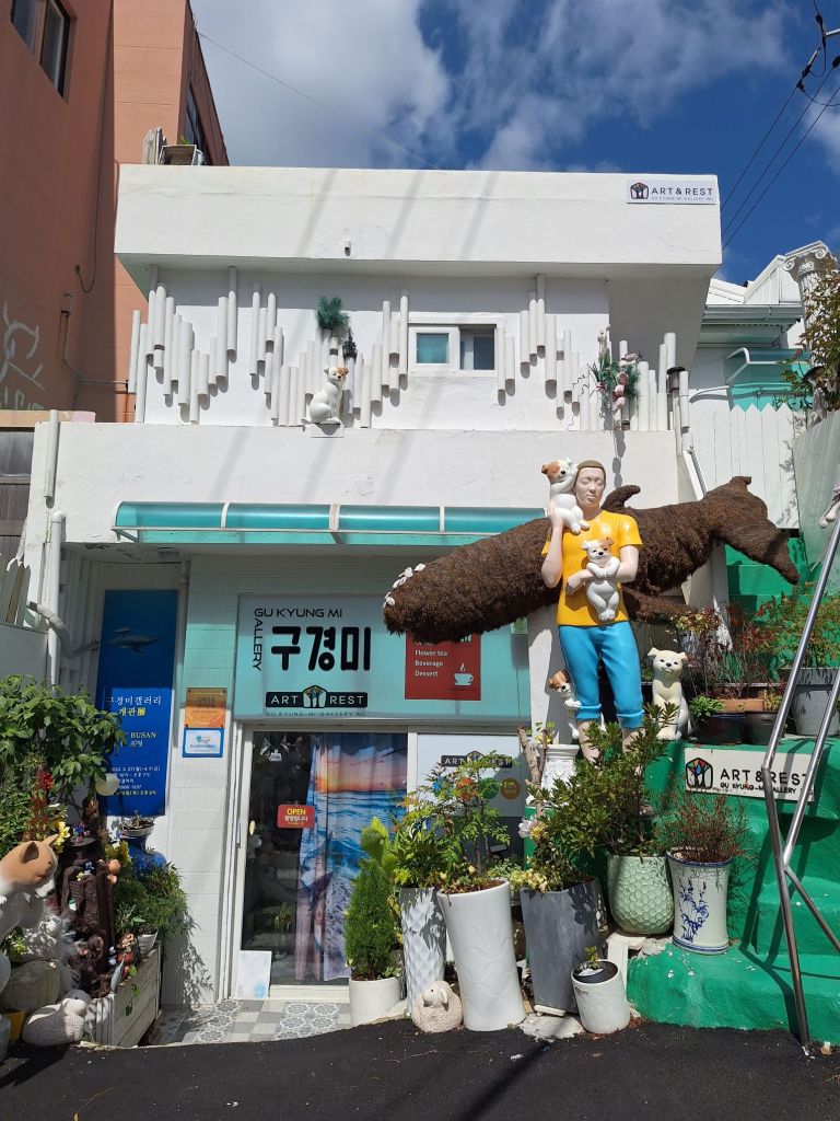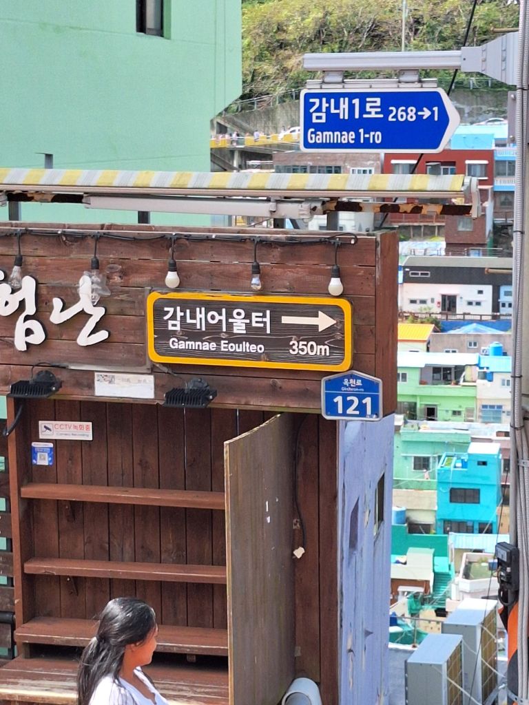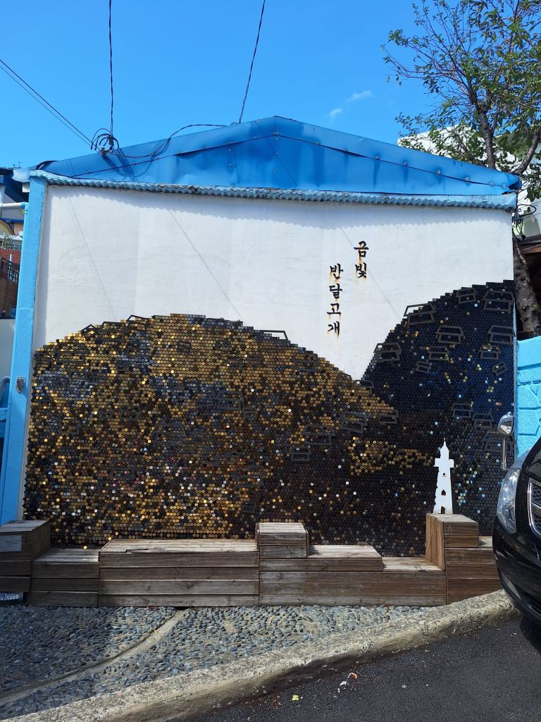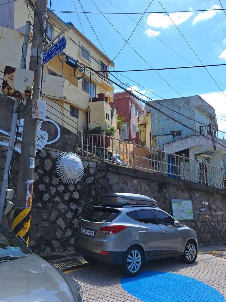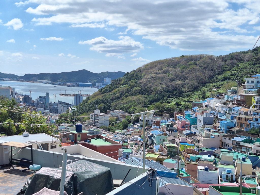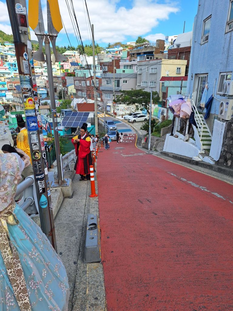 I ostatnia jak do teraz atrakcja – malownicza i barwna wioska Gamcheon Village. Wybudowana została w latach 1920-1930 na wzgórzu osiągającym 350 metrów nad poziomem morza dla robotników portowych pracujących w niedaleko położonych dokach. Początkowo pewien rodzaj slumsów, w późniejszych latach (od 1955) zasiedlona już przez pozostałe grupy mieszkańców Buzanu, którzy oczywiście tam w dalszym ciągu mieszkają. Nie powiem – nie zazdroszczę im wcale tego życia. Wchodzenie tam nie jest rzeczą prostą a schodzenie w dół też nie jest łatwe. Tym razem się zmądrzyłam i małym autobusikiem dotarłam na sam szczyt tego trochę kuriozalnego osiedla. Potem już tylko czekała mnie wędrówka w dół. Tym razem, na wchodzenie pod górę się nie zdecydowałam. A ostateczny widok był naprawdę uroczy. Domki we wszystkich możliwych kolorach, otoczone zielenią ze wzgórz, tworzą malowniczą kompozycję i wspaniale nadają charakter temu miejscu.