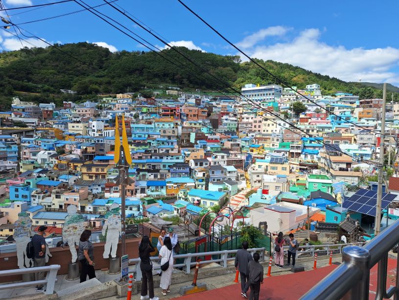 I ostatnia jak do teraz atrakcja – malownicza i barwna wioska Gamcheon Village. Wybudowana została w latach 1920-1930 na wzgórzu osiągającym 350 metrów nad poziomem morza dla robotników portowych pracujących w niedaleko położonych dokach. Początkowo pewien rodzaj slumsów, w późniejszych latach (od 1955) zasiedlona już przez pozostałe grupy mieszkańców Buzanu, którzy oczywiście tam w dalszym ciągu mieszkają. Nie powiem – nie zazdroszczę im wcale tego życia. Wchodzenie tam nie jest rzeczą prostą a schodzenie w dół też nie jest łatwe. Tym razem się zmądrzyłam i małym autobusikiem dotarłam na sam szczyt tego trochę kuriozalnego osiedla. Potem już tylko czekała mnie wędrówka w dół. Tym razem, na wchodzenie pod górę się nie zdecydowałam. A ostateczny widok był naprawdę uroczy. Domki we wszystkich możliwych kolorach, otoczone zielenią ze wzgórz, tworzą malowniczą kompozycję i wspaniale nadają charakter temu miejscu.