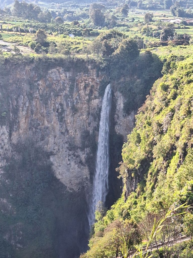 Obraliśmy kierunek na północny odcinek Jeziora Toba, próbując coś ciekawego po drodze zobaczyć i jednak zrobić sobie przerwę w połowie tej drogi. Zupełnie nie było sensu tłuc się tyle godzin przez te w miarę wąskie i zatłoczone szlaki, których dodatkowo jakość pozostawia wiele do życzenia. Po drodze trafił się piękny wodospad i piękny widok na północną część jeziora.