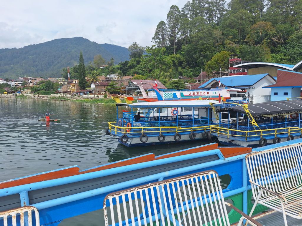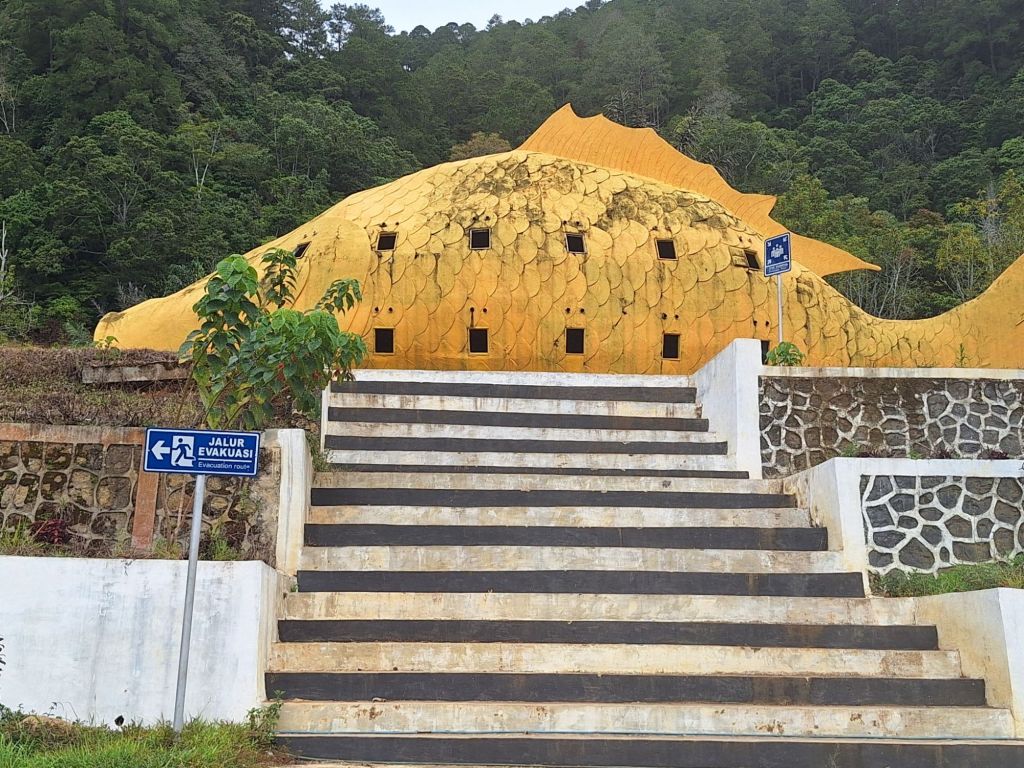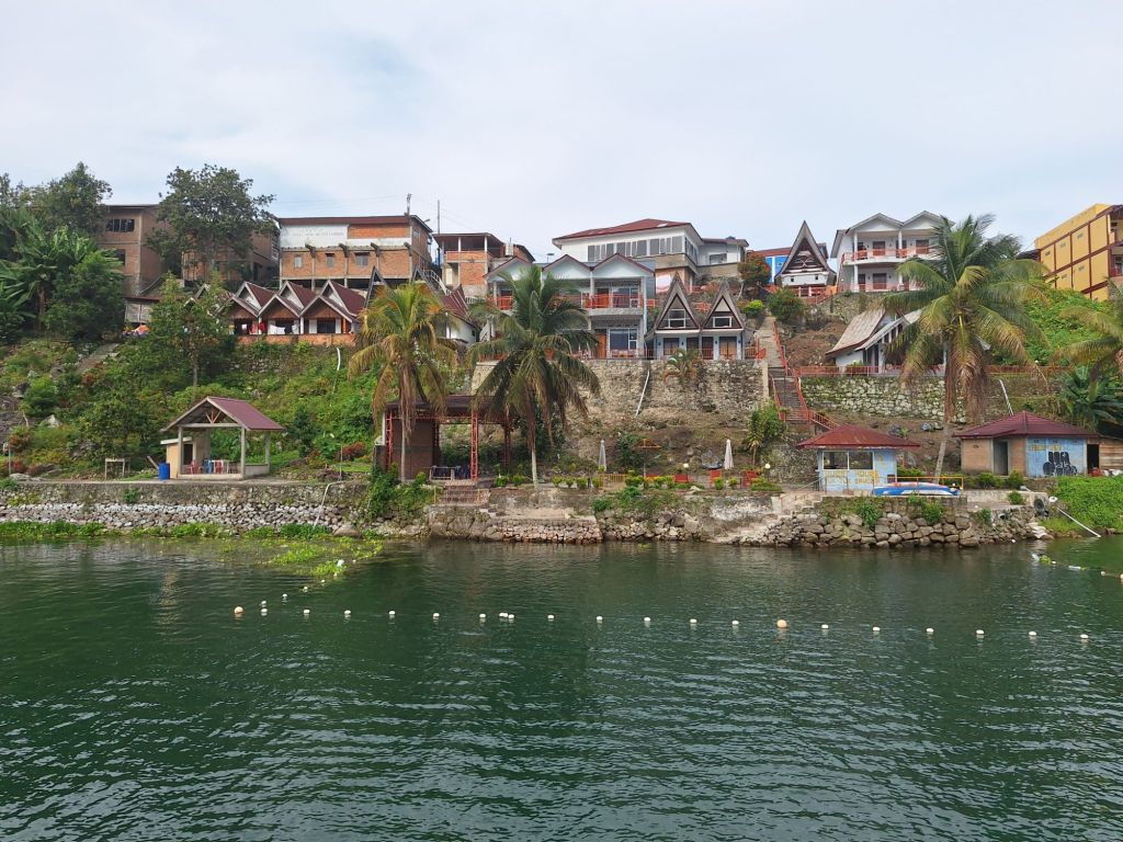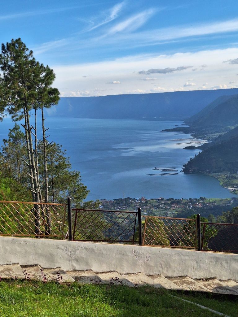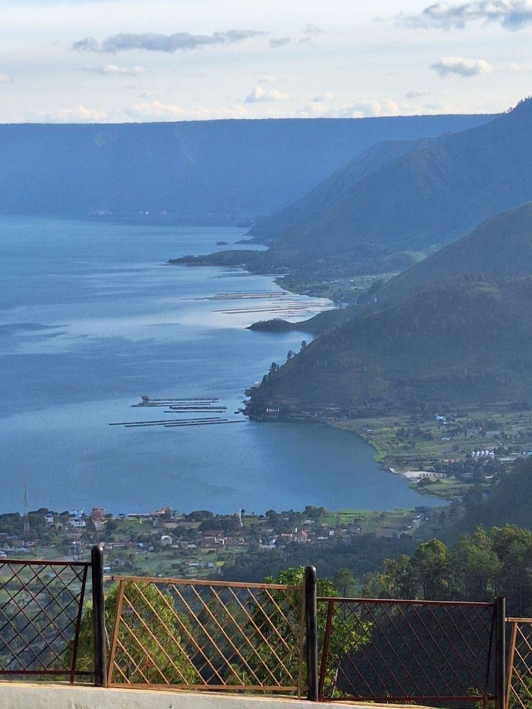 Po śniadaniu wyjazd w dalszą drogę do portu na wschodnim brzegu Jeziora Toba. Wybraliśmy ten sposób przedostania się na wyspę, bo droga lądowa zajęłaby znowu ładnych parę godzin. Jezioro Toba jest ogromne. Ma 100 km długości, 30 km szerokości a jego głębokość sięga miejscami do 500 metrów . Powstało w wyniku ogromnego wybuchu wulkanu ok. 70.000 lat temu i jest największym jeziorem wulkanicznym na ziemi. Według niektórych teorii, erupcja ta wpłynęła na klimat całej planety i populację wczesnych ludzi. Pośrodku jeziora znajduje się wyspa, która podobno wielkością dorównuje Singapurowi. Objechanie jej drogą nadbrzeżną dookoła zajmuje ponad pięć godzin. Po drodze do portu obejrzeliśmy starą wioskę jednego z wodzów dużego klanu, zwanych tu królami, wypiliśmy świetną kawę w jakiejś kafejce i obejrzeliśmy pomnik tzw. Golden Fish – złotej ryby, charakterystycznej dla Jeziora Toba.