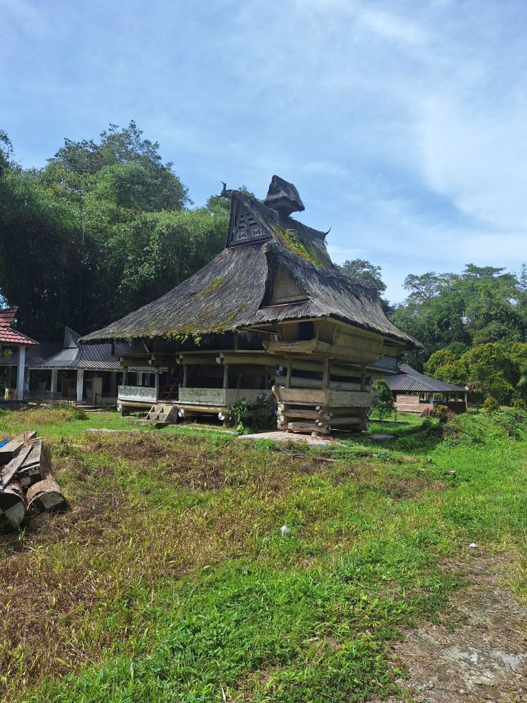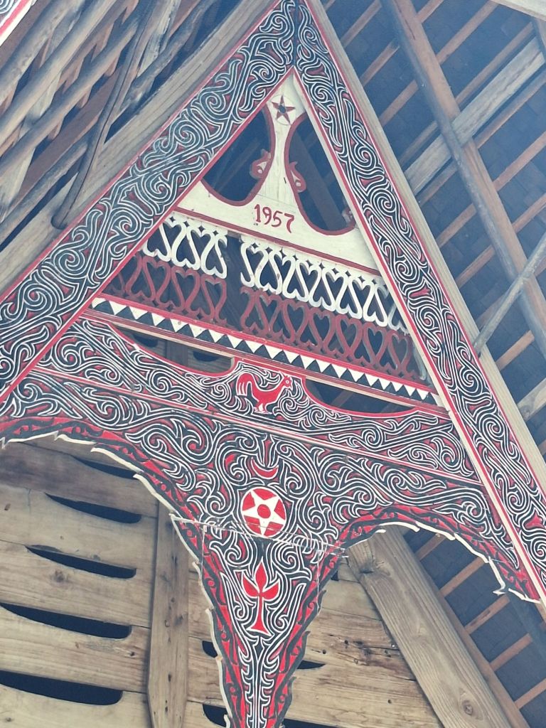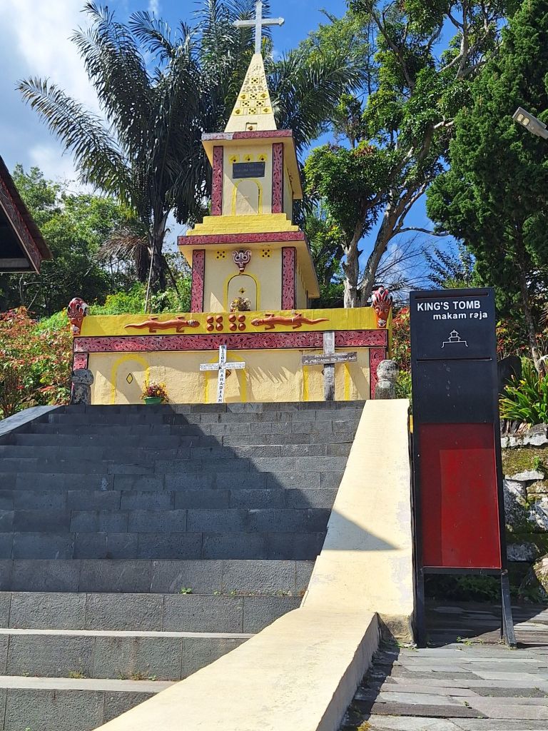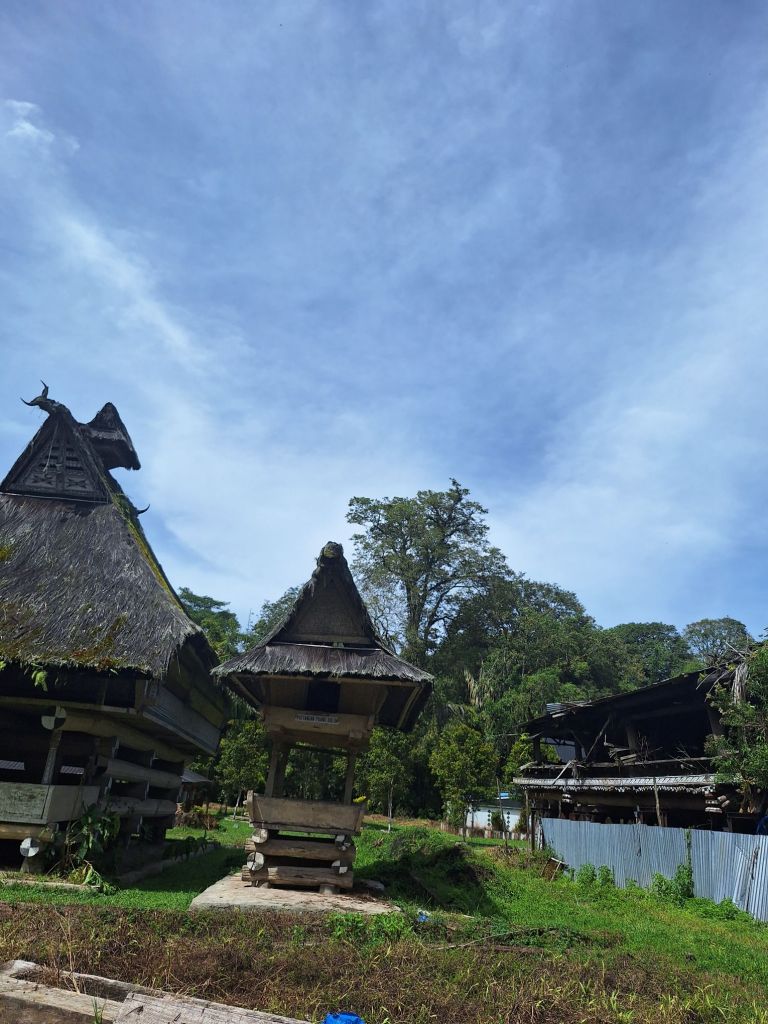 Następnego dnia wyjechaliśmy na zwiedzanie. Region Jeziora Toba jest domem grupy etnicznej Batak Toba. Ich kultura różni się bardzo od reszty Indonezji. Przeważają tu chrześcijanie, a ich domy są budowane z dachami w kształcie łodzi lub rogów bawoła. Charakterystyczne są tutaj także grobowce w postaci wieżyczek, które stawia się bardzo często przy domach. Najwyżej układane są kości przodków, a niżej młodsze generacje. Kości te, w 5 lat po pogrzebie są wyjmowane z grobów i przenoszone do wspomnianych grobowców. Pojechaliśmy zobaczyć taką wioskę króla. Oczywiście stanowi ona obiekt raczej już komercyjny, ale w dalszej drodze widzieliśmy tego typu domy, już naprawdę stare i będące ciągle w użyciu.
