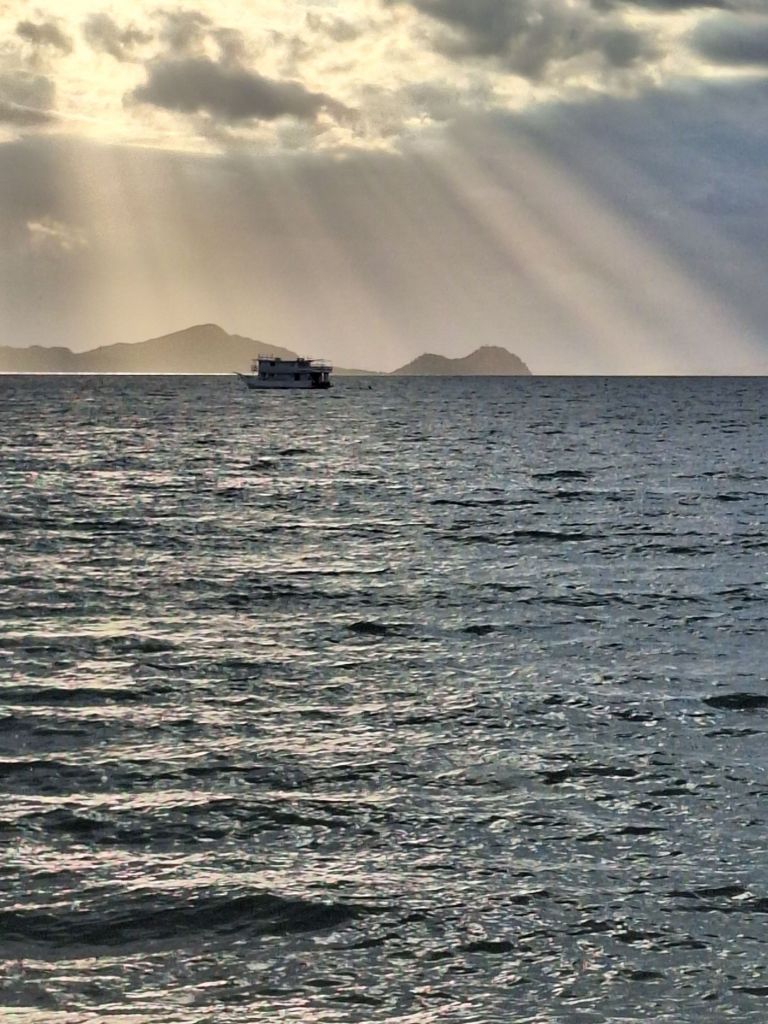 Po południu szykowaliśmy się na piękny zachód słońca na plaży, ale o 4.00 po południu wygonił nas z niej deszcz. Udało mi się tylko popatrzeć trochę na morze i na „bezrobotne” łodzie, czekające tak jak i my na otwarcie parku. W nocy lało i grzmiało niemiłosiernie.