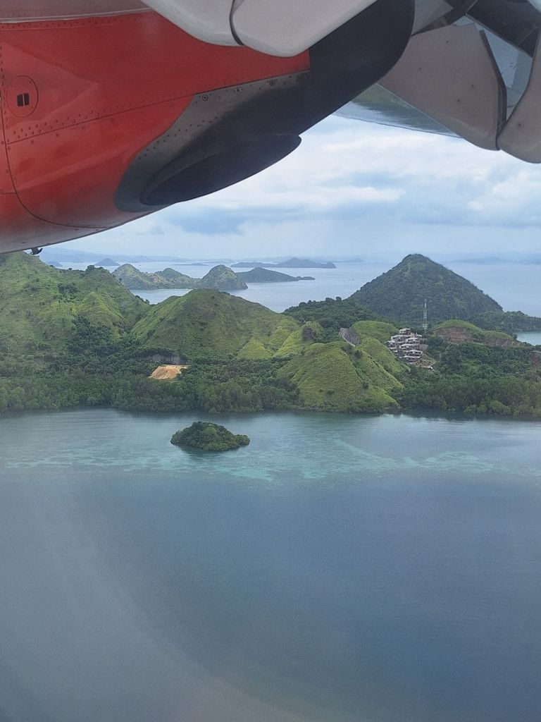 W czwartek, 19 lutego wróciłam do Labuan Bajo. Nie obyło się oczywiście bez przygód. Miałam przylecieć osiemnastego lotem bezpośrednim, trwającym godzinę. Niestety lot został odwołany z uwagi na brak odpowiedniej ilości pasażerów. W tym układzie nie było innej możliwości jak lecieć następnego dnia o 7.00 rano z przesiadką na wyspie Timor Zachodni, międzylądowaniu w Bajawie i po 5 godzinach dotarłam na miejsce, trochę z duszą na ramieniu, bo leciałam jakąś zabawką, zabierającą na pokład tylko 70 pasażerów, a nie prawdziwym samolotem 🙂 Za to widoki były fantastyczne.