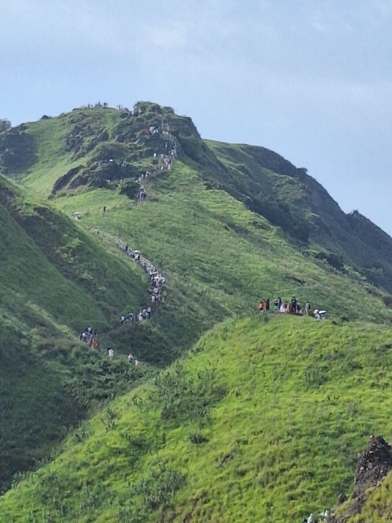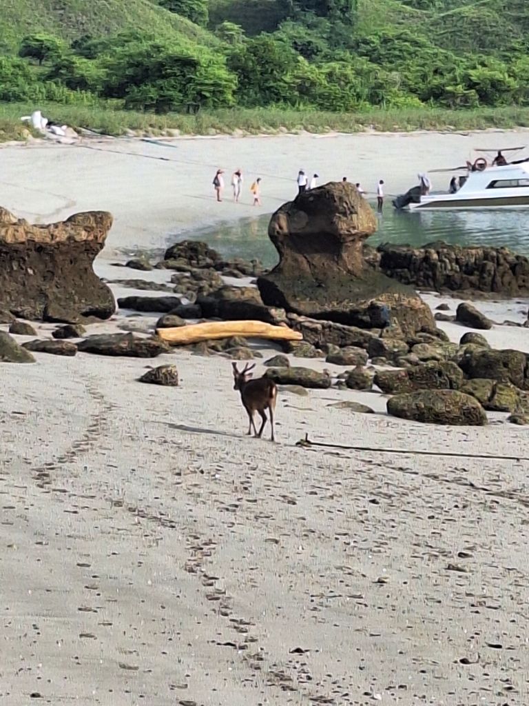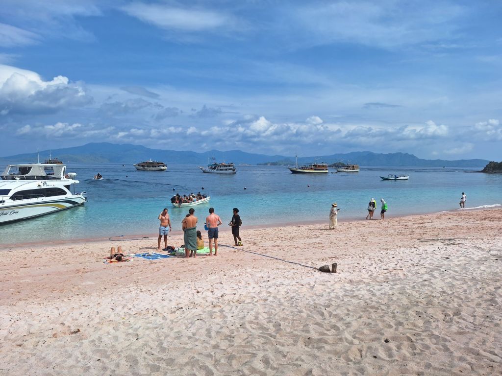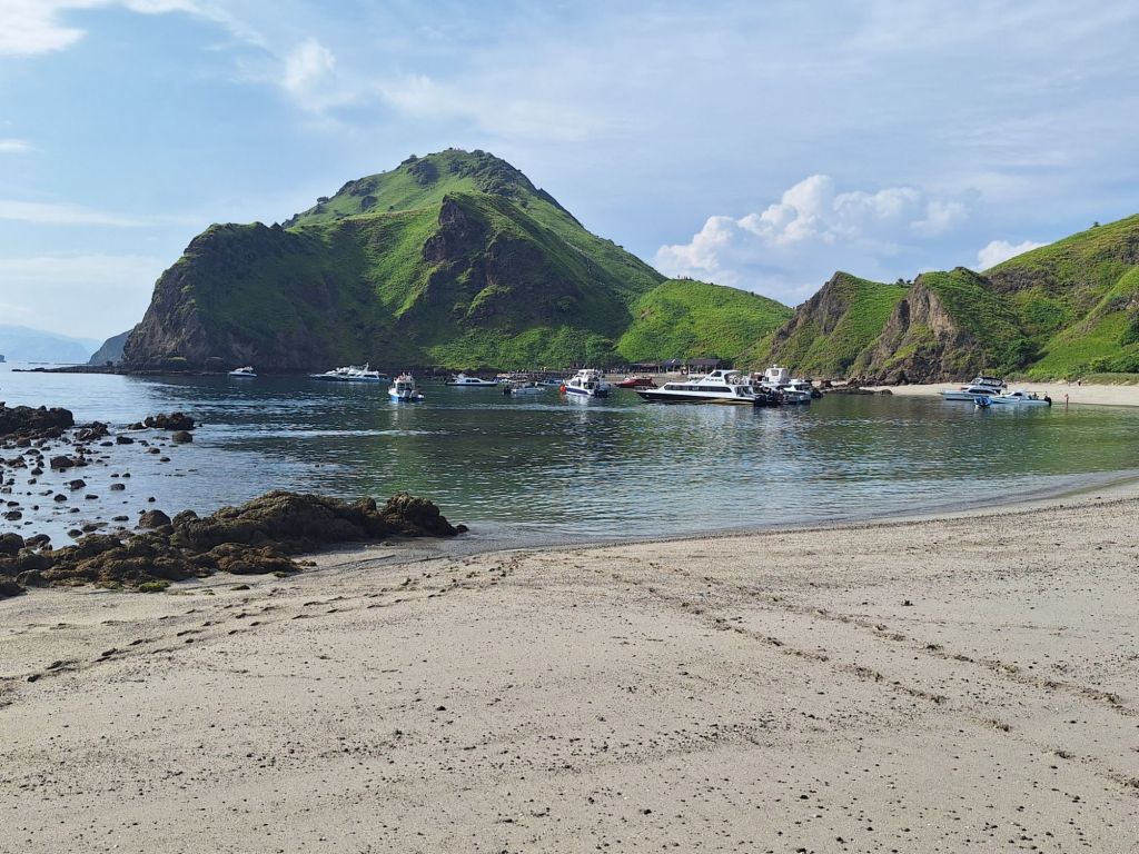 W sobotę o 5.30 zabrano nas z hotelu i przewieziono do portu. Zebrano nas tam do kupki, zarejestrowano i w końcu usadowiono w wyjątkowo dużej i bardzo szybkiej łodzi. Plan wycieczki był raczej napięty – lądowanie na trzech wyspach i nurkowanie też w trzech następnych miejscach. Widoki po drodze przewspaniałe – mijaliśmy po kolei większe i mniejsze wysepki z przepięknymi plażami. Pierwszy postój na wyspie Pulau Padar. Pobyt tutaj łączył się z trackingiem na szczyt góry, z którego był widok na najbliższą okolicę. Wchodziło się tam po jakiej dużej ilości schodów i uznałam, że tego typu wspinaczki mam już dosyć. Była to zresztą rozsądna decyzja, bo po tych schodach wspinały się dziesiątki przede wszystkim Chińczyków, przy których robienie jakichkolwiek zdjęć czy wideo staje się niemożliwe. Zostałam na dole, podziwiając wszystko z niższego pułapu.