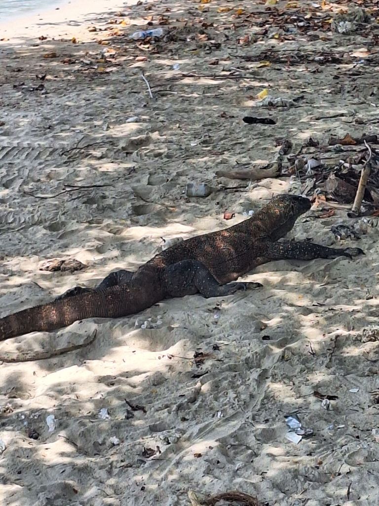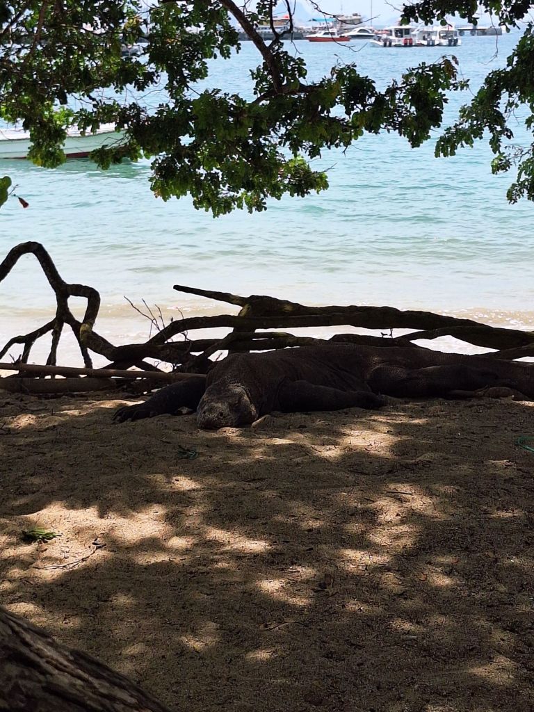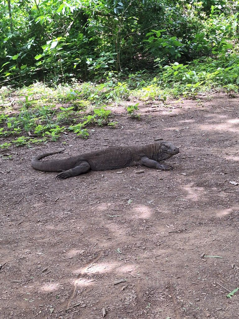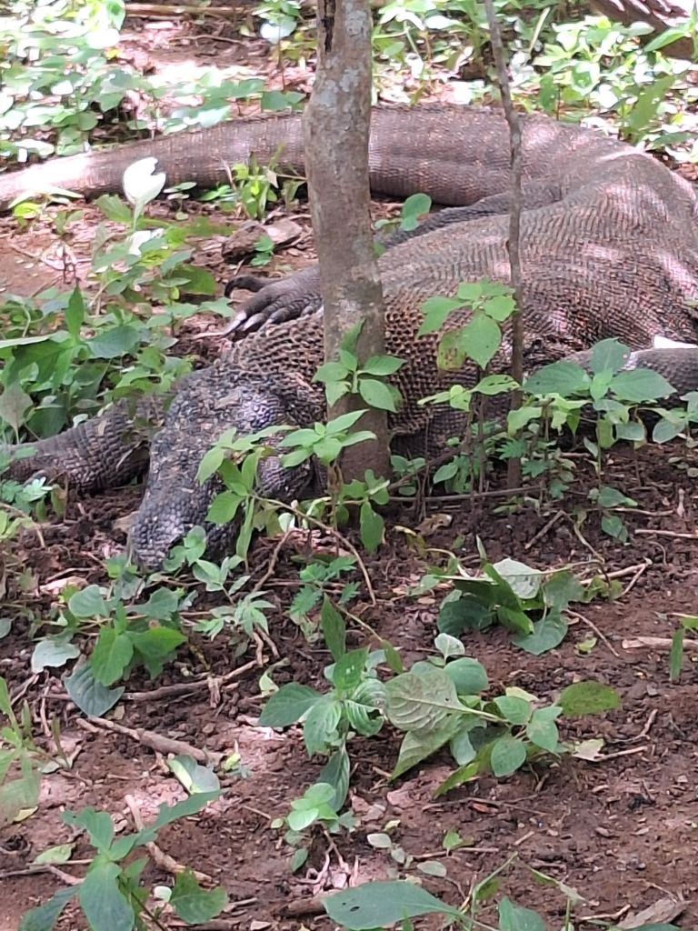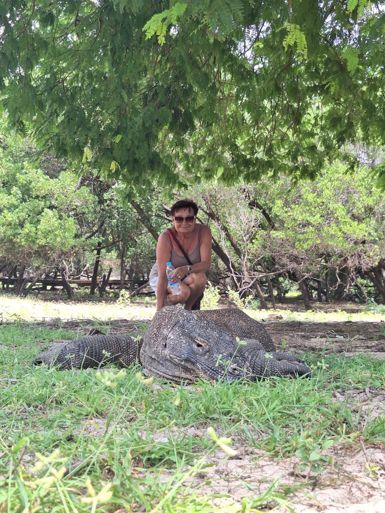 A potem już była prawdziwa wyspa Komodo, od której pochodzi nazwa parku i która jest największą wyspą w tym dosyć dużym archipelagu. I to był ten główny cel podróży, bo w końcu przecież musiałam zobaczyć warany, nazywane tu smokami. No i tutaj nie obyło się bez poczucia komercji. Trochę to wszystko jest jednak przereklamowane. Niektóre mniejsze warany leżą już blisko plaży sprawiając wrażenie zwierząt wystawionych na pokaz, po to, by jednak turysta mógł je zobaczyć. Potem wcale nie taki długi spacer przez tereny leśne, żeby zobaczyć coś większego i powrót do łodzi. Całą wycieczkę przejęli tzw. rangersi, którzy na wszelki wypadek zaopatrzeni byli w długie kije z rozwidleniem na końcu. Podobno, w przypadku ataku warana, wystarczy złapać go tym kijem od góry za szyję i w ten sposób można go unieruchomić. Jakoś żaden z napotkanych waranów, nie wyglądał na takiego, któremu by się chciało łapać kogoś za łydkę, ale może się mylę 🙂 Pewnie, gdyby mu tę łydkę podstawić prosto pod nos, to może jakaś reakcja by nastąpiła, ale tutaj przewodnicy dzielnie pilnowali, żeby jednak za blisko do nich nie podchodzić. No dobrze, chciałam, planowałam, zobaczyłam, a że mam takie a nie inne odczucia, to już nic na to nie poradzę. Nigdy nie lubiłam podziwiania interesujących miejsc i zwierząt w tłumie i pewnie to też wpłynęło jak zwykle na mój odbiór całej tej imprezy. Innej drogi nie było – cel został zrealizowany – mission accomplished.