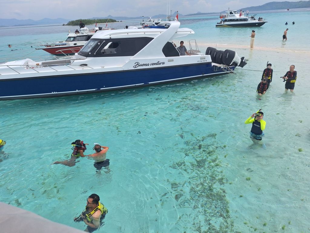 Na następnej wyspie Dua Putra mieliśmy dłuższy postój. Można było popływać, ponurkować, podano nam lunch. Był czas na chwilę relaksu. Morze krystalicznie czyste, woda trochę chłodniejsza niż przy lądzie, warunki do nurkowanie idealne. Ponieważ nasza łódź była faktycznie bardzo szybka, udało nam się być tam trochę wcześniej od innych łodzi, które wypłynęły z portu razem z nami lub trochę po nas. Tym sposobem było luźniej w wodzie i na plaży.